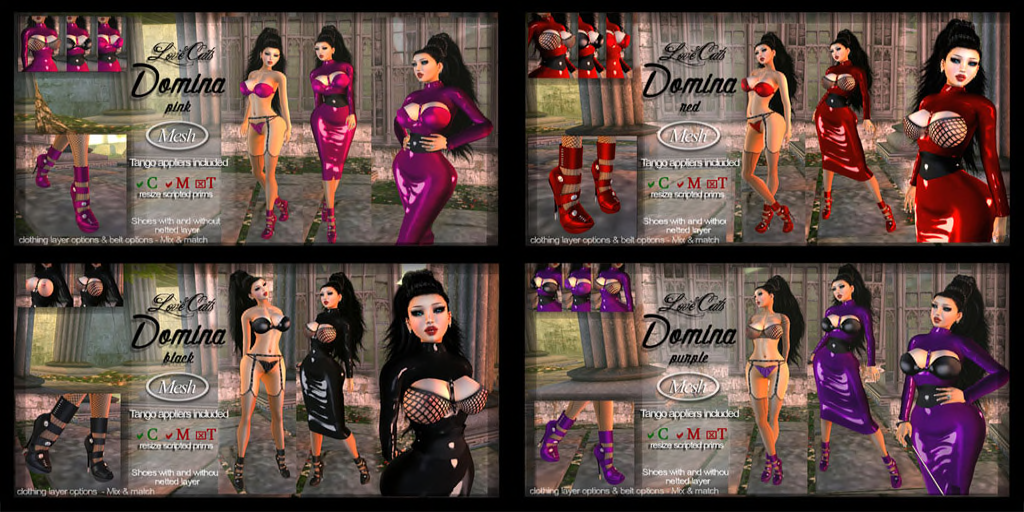 Do you know someone who has been a bad kitty? Domina is the perfect outfit to wear when you put them in their place! A lickable latex dress in 5 mesh sizes with 3 different top options (Tango appliers included), mile high stiletto heels with or without fishnets, skin tone hud for the shoes, pretty panties and a crop to whip them into submission. Domina comes in black, red, purple and pink.